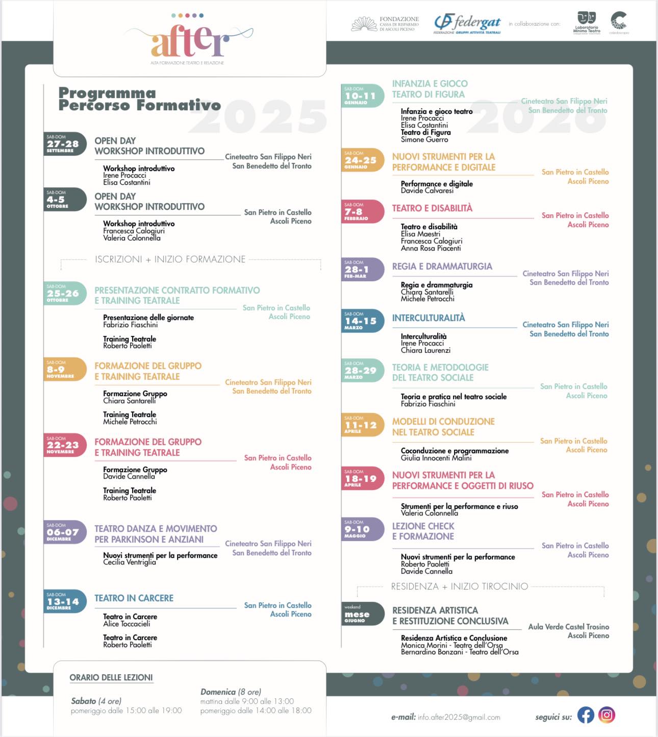 “Con AFTER vogliamo offrire ai giovani un’opportunità concreta di crescita professionale e personale, valorizzando il teatro come strumento di trasformazione sociale”, afferma Fabrizio Fiaschini, presidente Federgat e direttore scientifico del progetto.